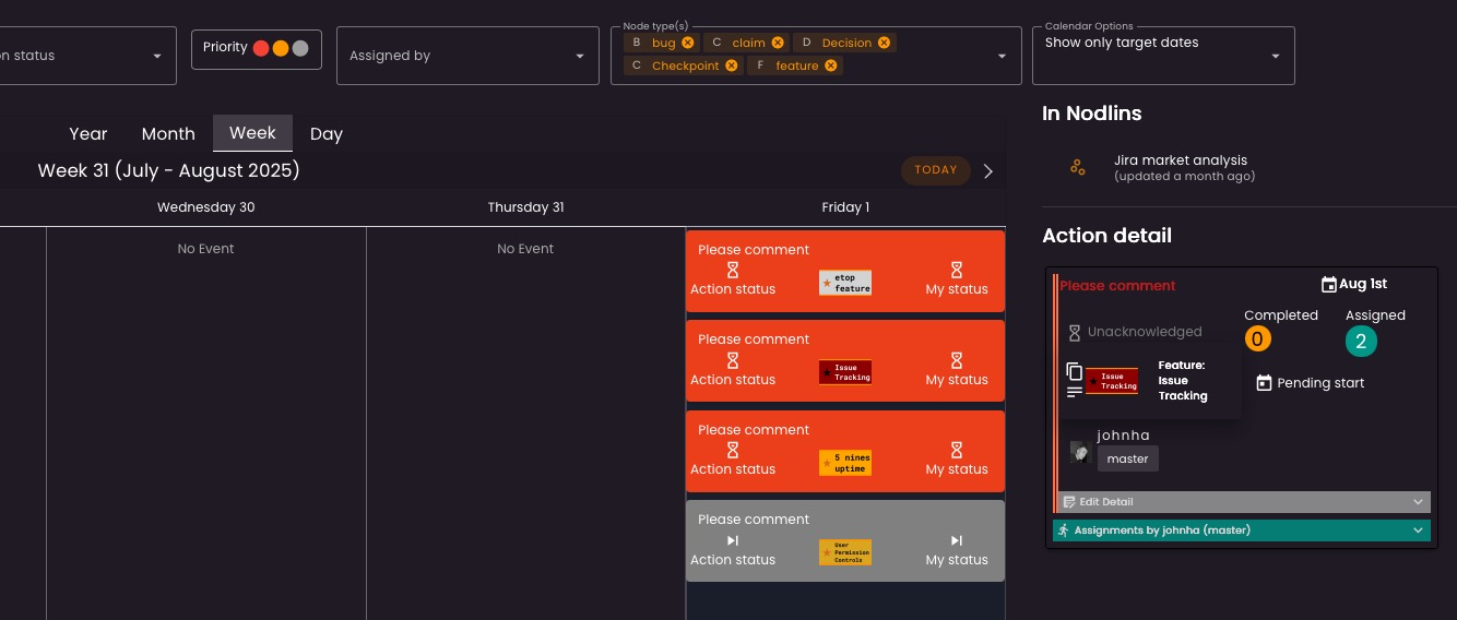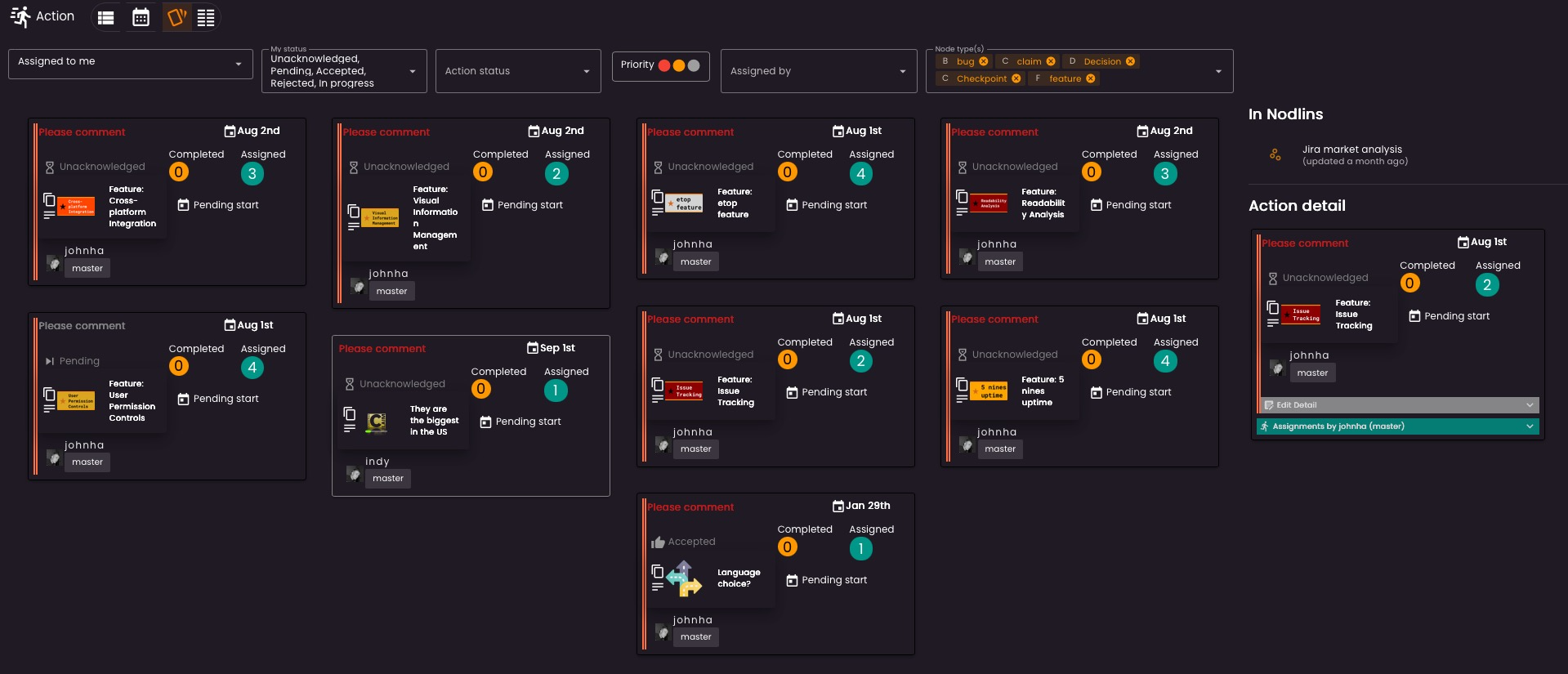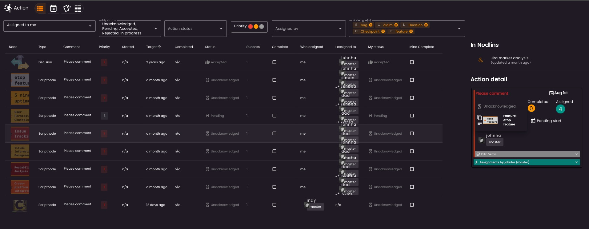 Obviously tracking actions and assignments it not something you only want to do in the nodlin view. You have a full actions list where you can view and filter all actions assigned to you, the priority, current status (in progress, not accepted etc), who assigned it to you, and also by specific type of node (tasks, project etc).
