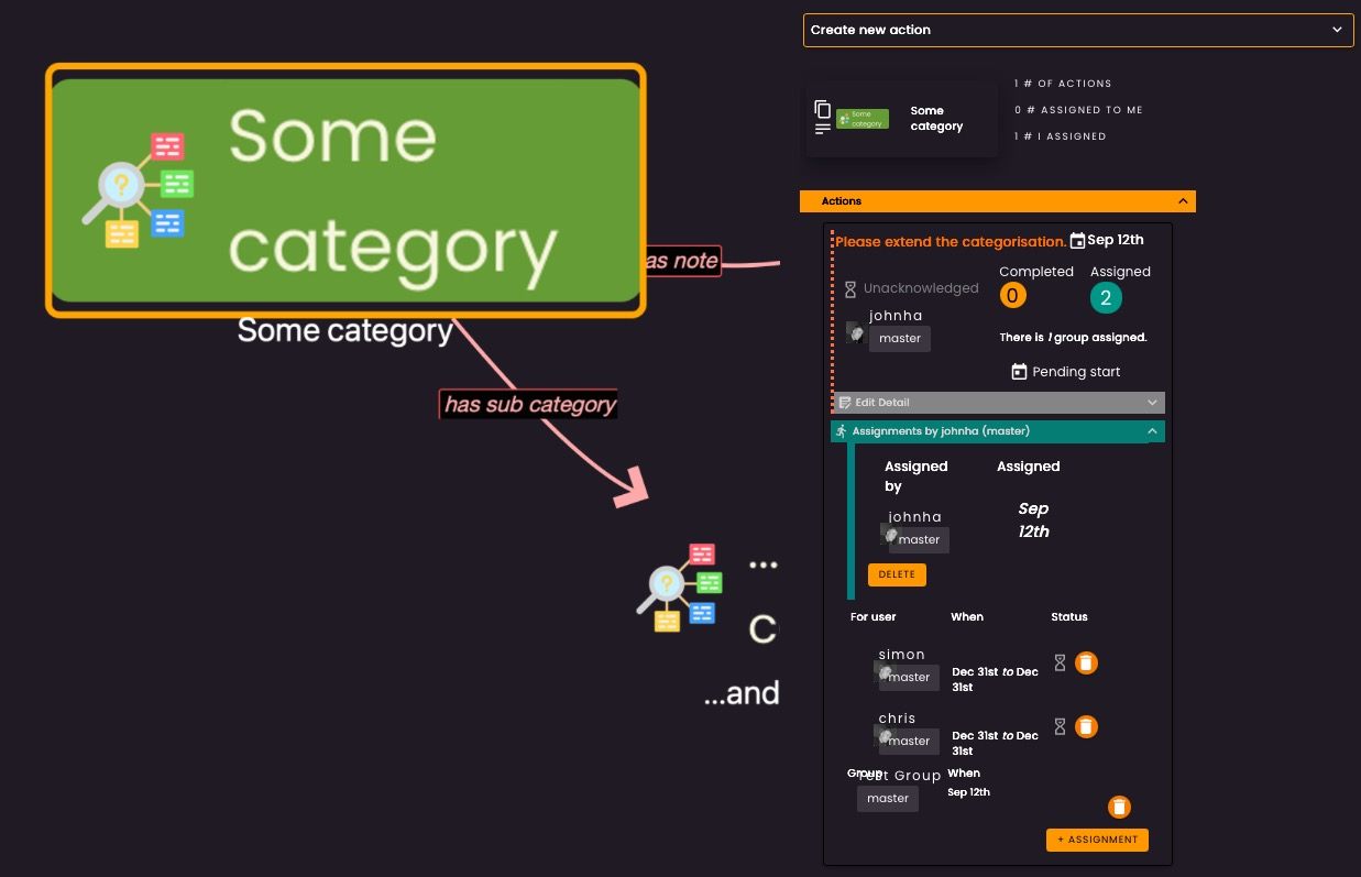 A node can be associated to any number of actions. The action though is not the fundamental unit of work to be done, but rather a description of what needs to be done. These actions can have multiple assignments which represent either a list of groups or individuals that are expected to perform some action.