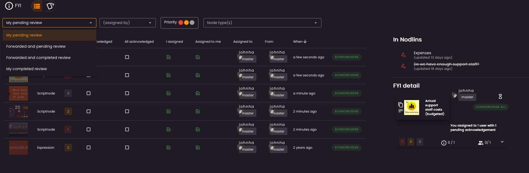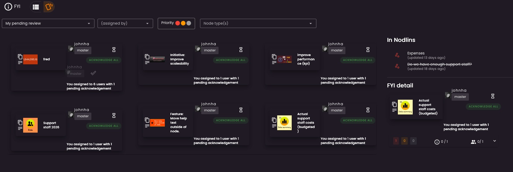 The FYI’s (as with actions) are available to view for a specific nodlin, or all FYI’s assigned to you.