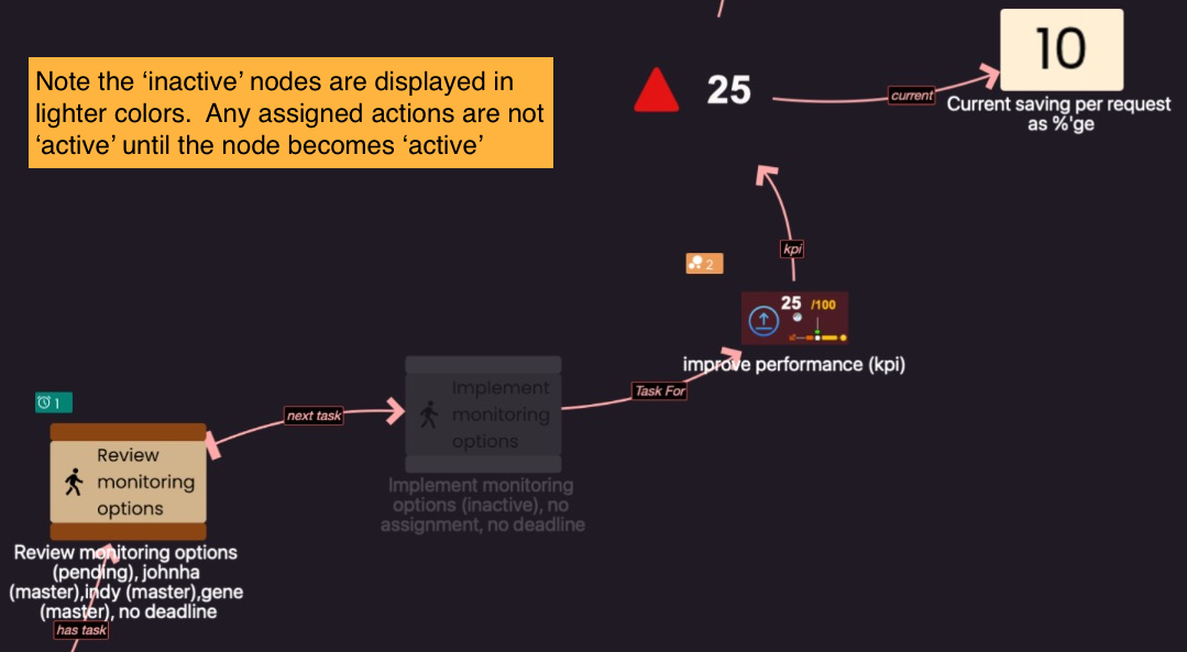 An action works in conjunction with another fundamental property of a node, active. Actions are only shown to users if the node is active. Note that inactive nodes are still shown on the nodlin display but in lighter colors so user has a visual indication that the node is not active.