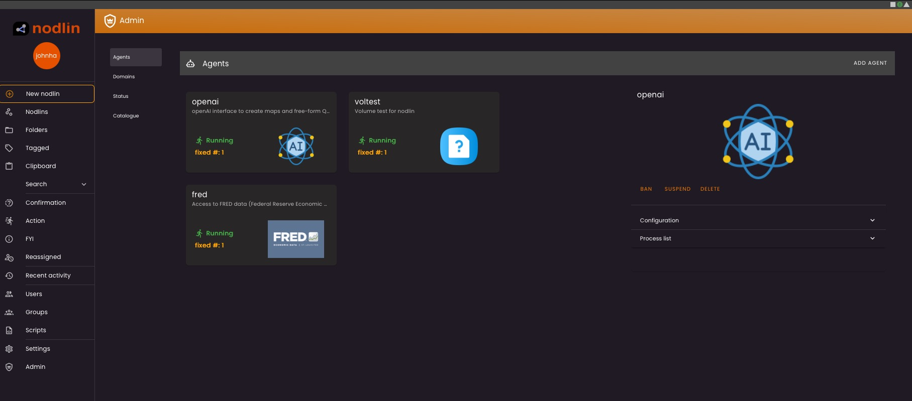 The nodlin domain administrator can register external agents (security keys, container, limits etc). These agents may simply act as an interface to allow you to extend an internal application to utilise nodlin (e.g. for workflow or notification).