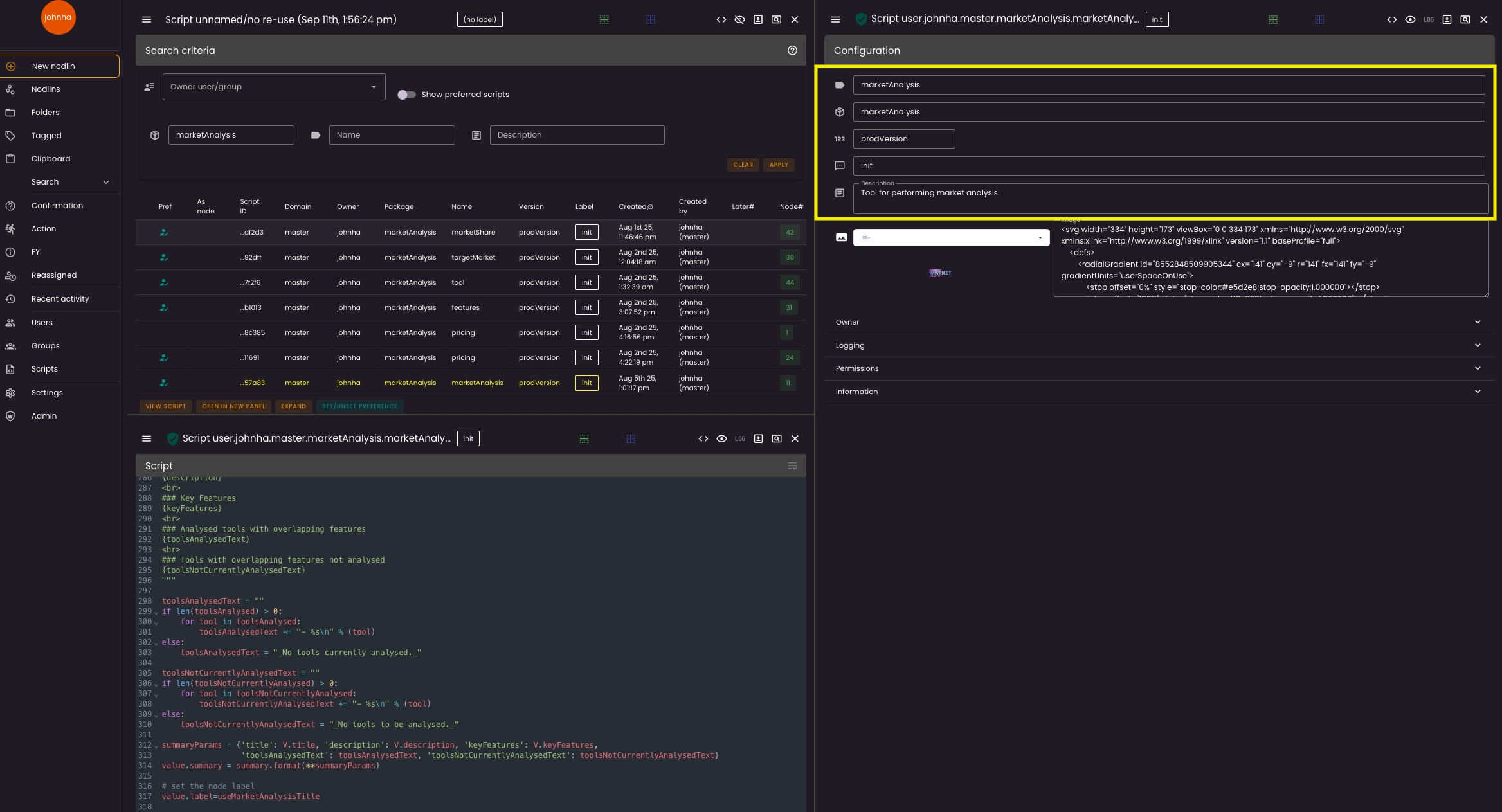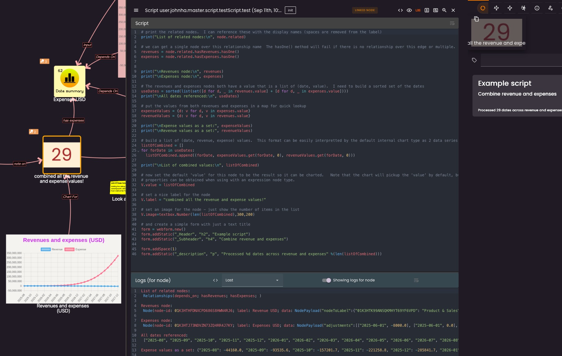 - Scripts - a simple python style syntax that allows you to implement your own business logic in the browser. These can be defined for the node itself (single-use), or you can name a script and share with others for general use.