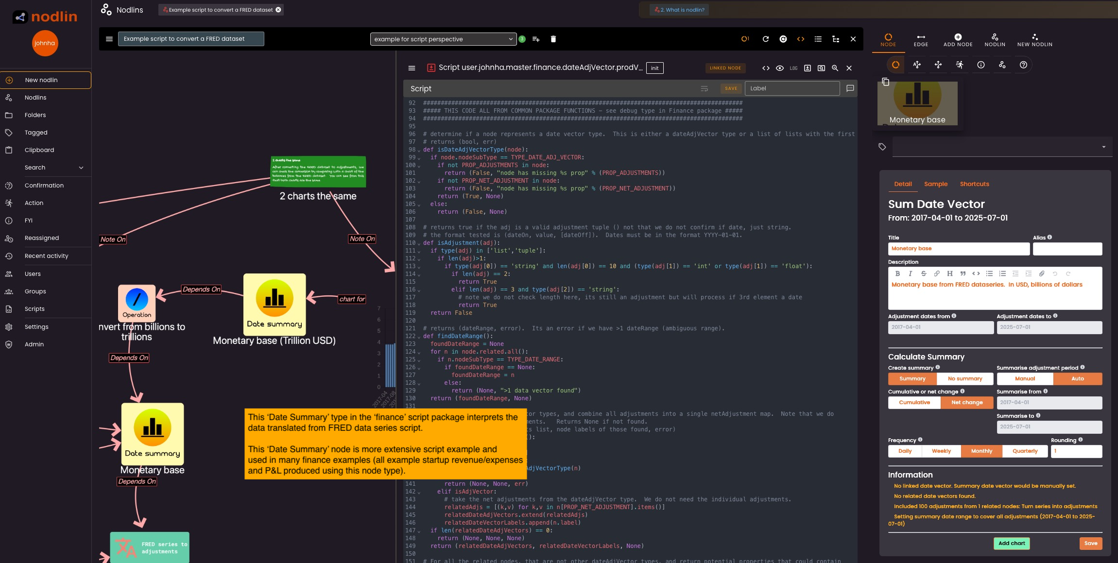 The finance Date summary node type is a core node type used in the finance package (more comphrehensive script example). It provides many features.
