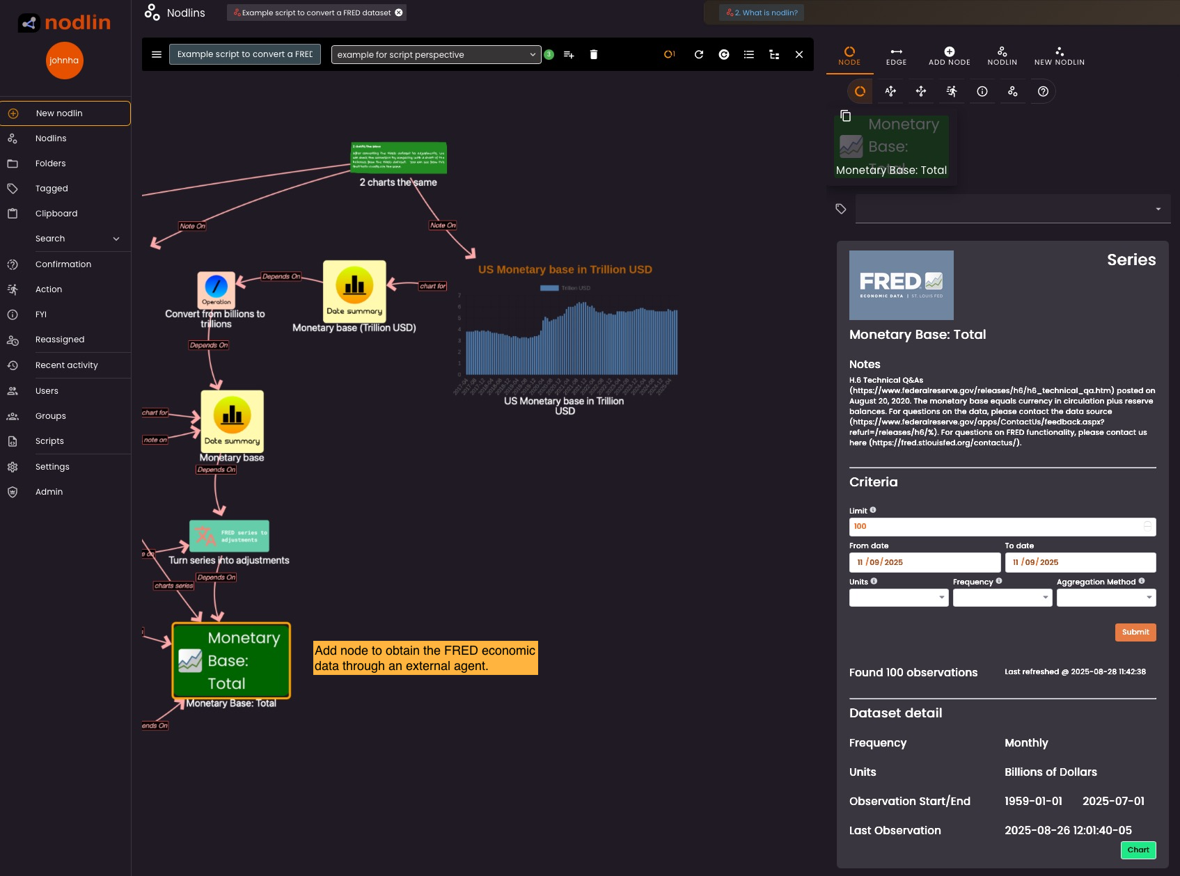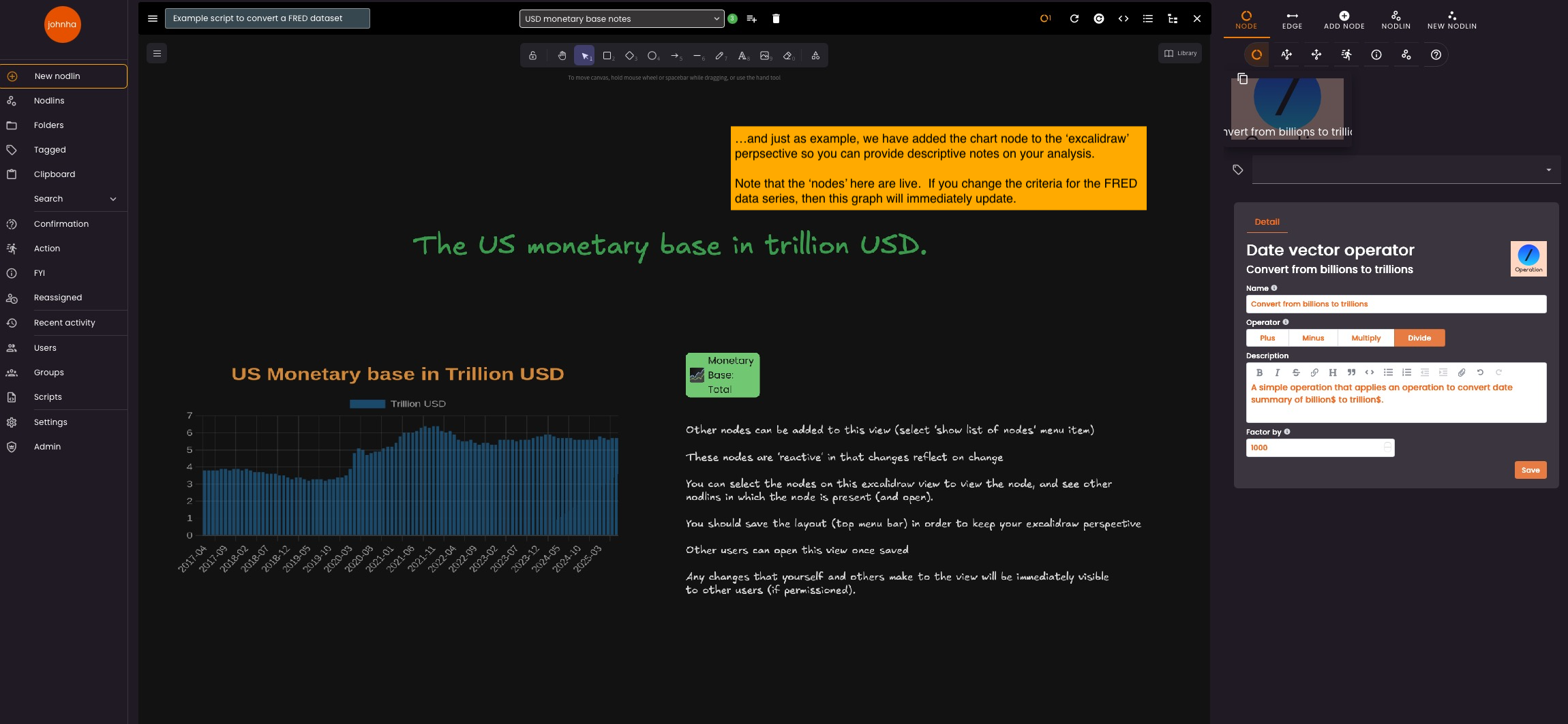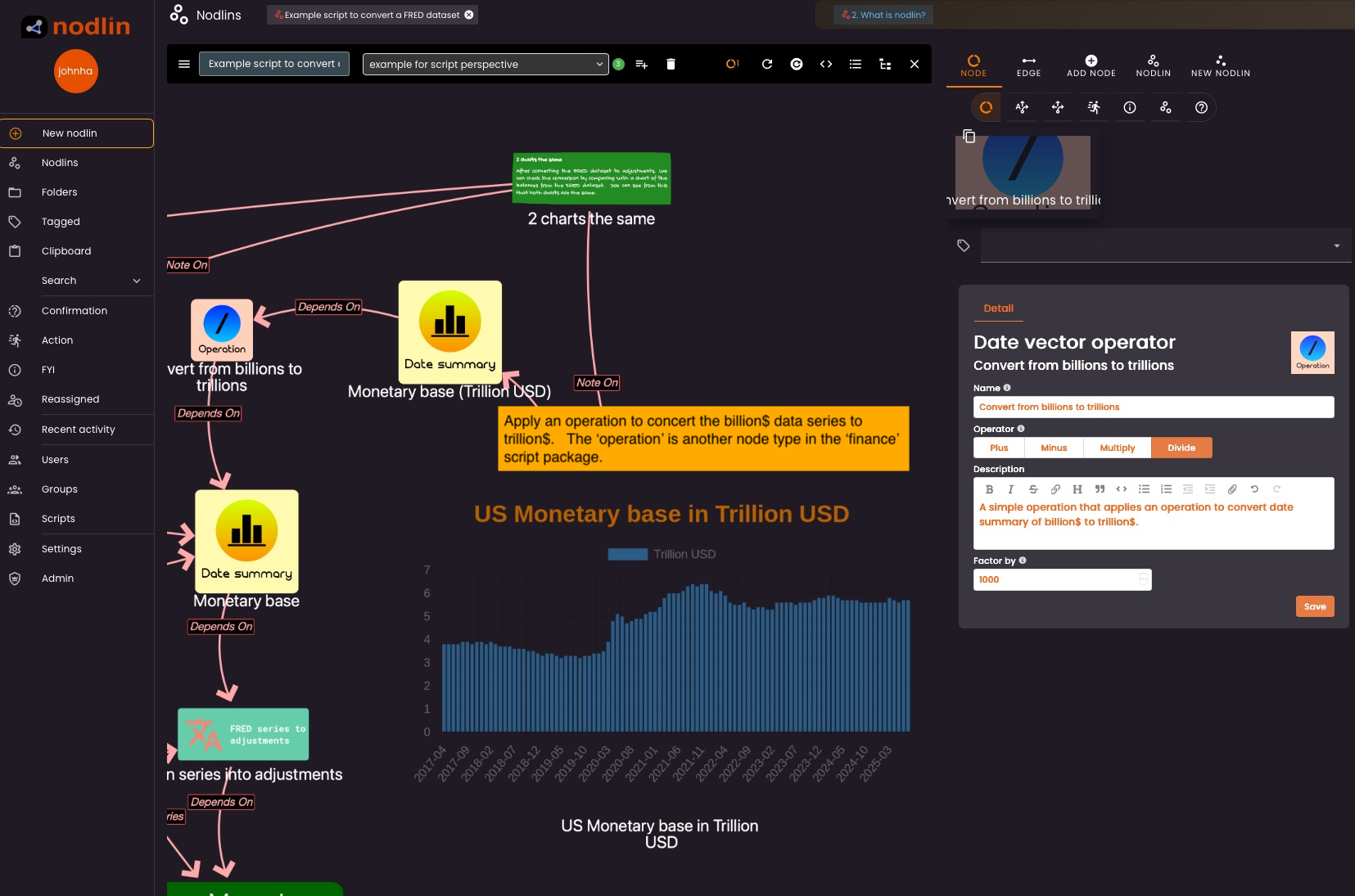 We apply an operation on the data set to convert to billion USD. We pass through a simple operation node type available in the finance package, that operates on Date Summary.