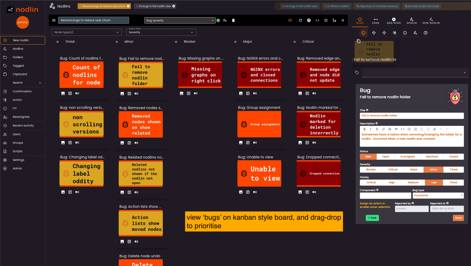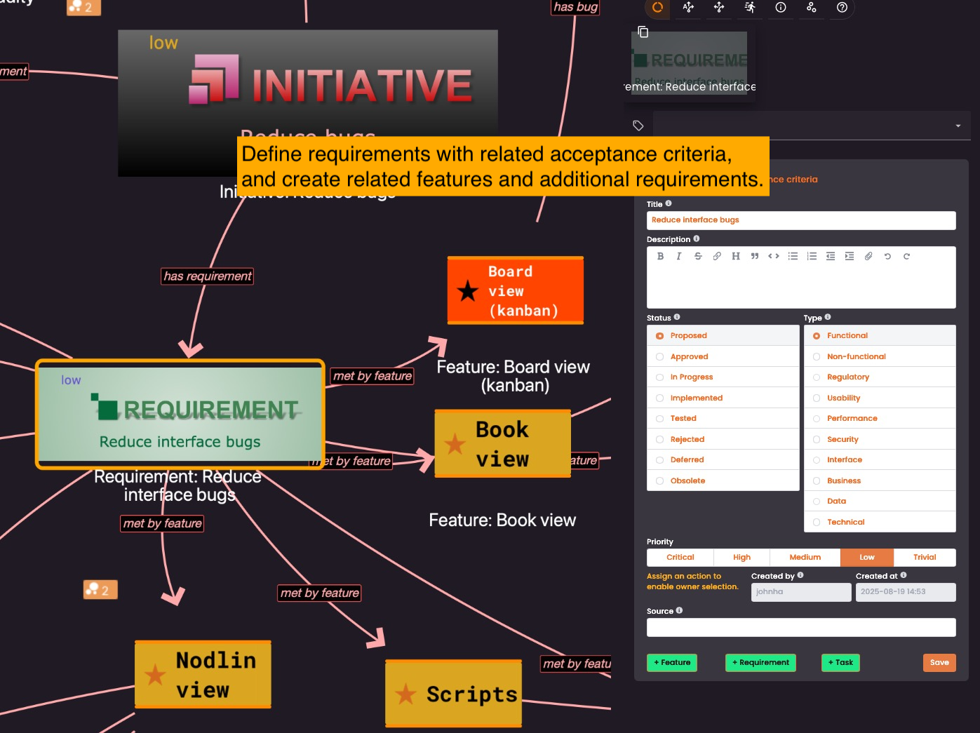 A bug can be associated with a feature. The board perspective is useful for prioritising bugs.