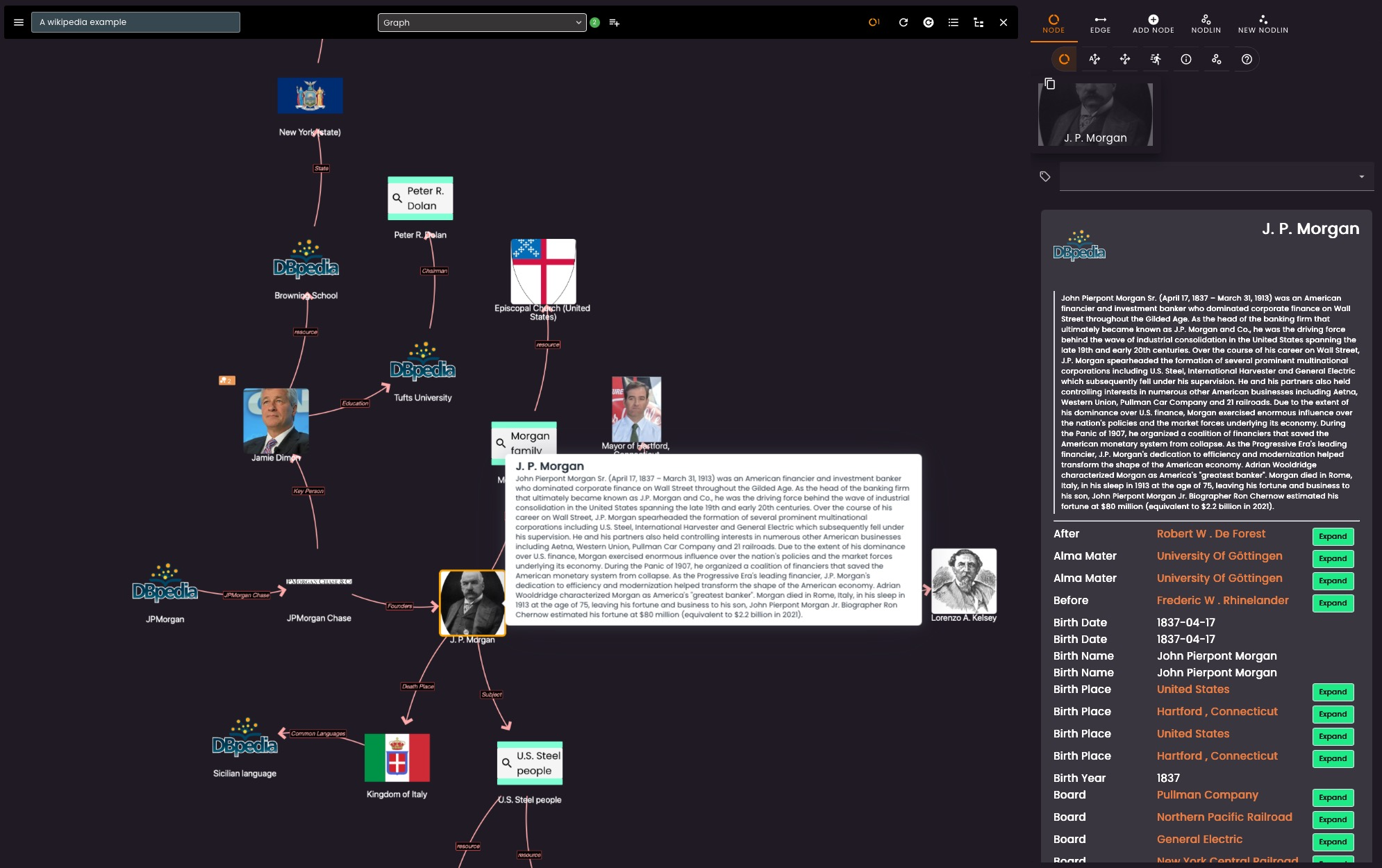 The following is an example search for a specific term (JP Morgan in this case), with various expansions of relations as recorded in the dbPedia ontology: